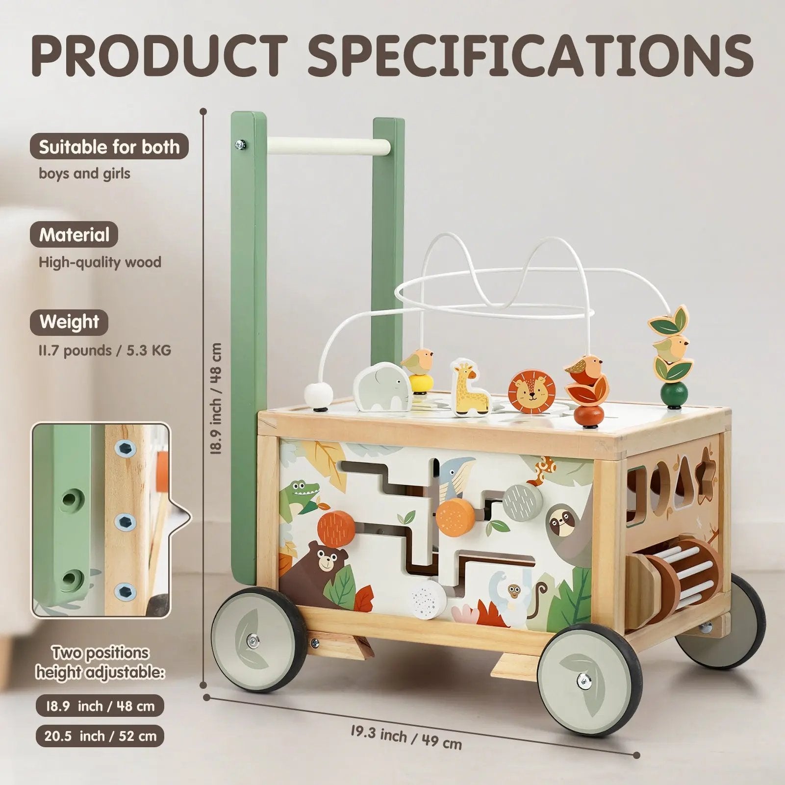 This captivating baby walker is packed with educational features, including a bead maze, rolling bell, abacus, and number board. These engaging elements enhance your child's hand-eye coordination, auditory perception, and foundational math skills. Additionally, the built-in storage box keeps toys organized, while the removable bead maze allows for seamless transitions between storage and playtime.
