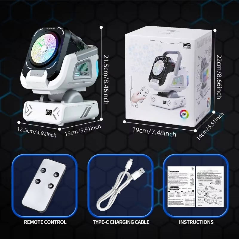 Enjoy up to 90 minutes of bubble-filled fun, complete with a battery level indicator that keeps you informed about when it's time to recharge. As the sun sets, watch in awe as the machine showcases nine vibrant colors, creating a stunning light display that elevates the festive mood.