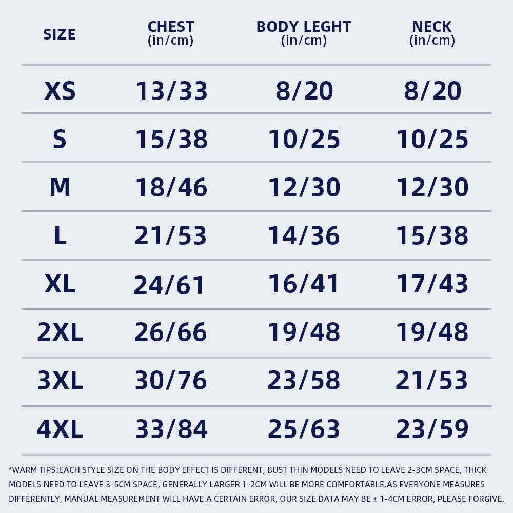 - Size 2XL: Chest 66cm/26in; Back Length 48cm/19in; Neck Circumference 48cm/19in